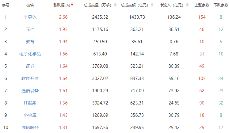 中国经济网北京8月22日新闻在早期交易中两个市场得到了增长。直到中午关闭,上海综合指数为3796.27点,增加了0.67%;深圳组件指数为12076.85点,增加了1.32%; Chinext指数为2661.97点,增加了2.56%。在行业,半导体,成分,教育和其他行业方面的增长率最高,而采矿油,天然气和服务,天然气,种植和森林的下降最高。 A股市场部门的增加和崩溃的排名