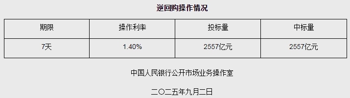公开市场业务交易公告[2025]第170号,2025年9月2日,中国人民银行对2557亿元人民币的运营进行了反向续签,并具有固定的利率和投标量。具体情况如下: